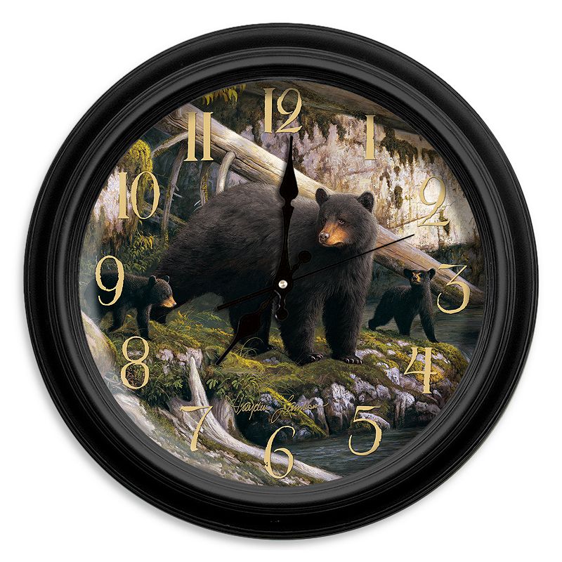 Adorn your walls with this Reflective Art wall clock, featuring an outdoor scene of a mother black bear and her two cubs