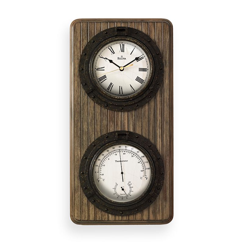 The built-in weather station adds to the appeal.A wainscoting case and aged black porthole bezels give this Bulova Monterey clock a rugged and historical look