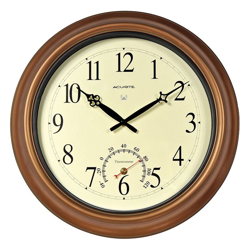 Check the time and the weather all in once place with this fantastic AcuRite 18-inch indoor \/ outdoor copper finish atomic clock and thermometer