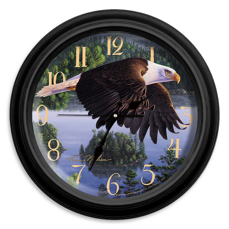 A bald eagle glides over a picturesque forest in this rustic Reflective Art wall clock