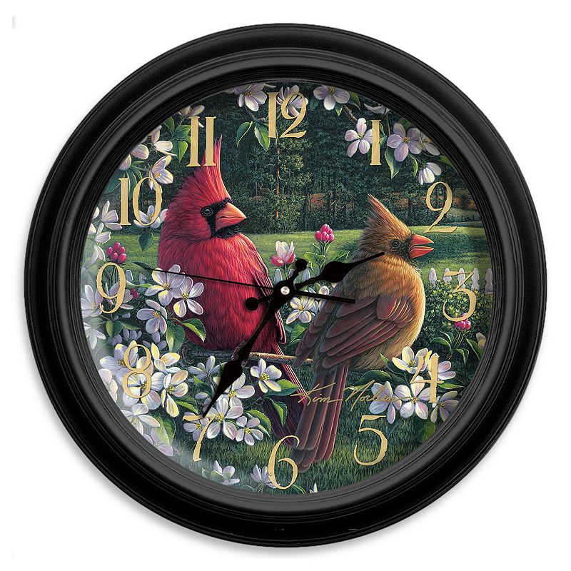 Cardinals perched among delicate cherry blossoms grace this Reflective Art wall clock