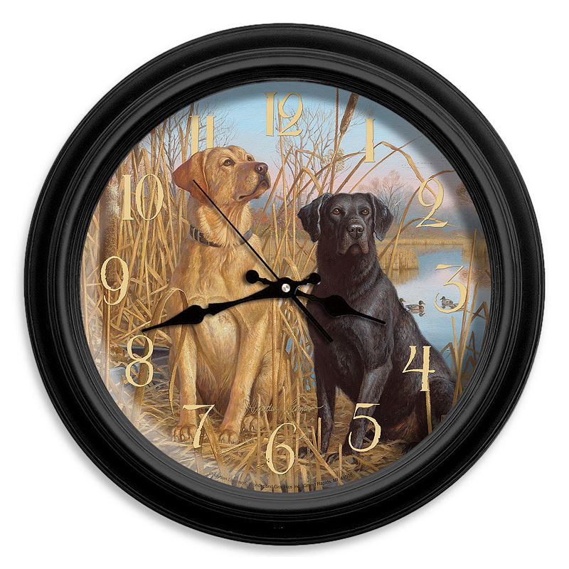 Bring a bit of the wilderness into your home with this Reflective Art wall clock, featuring a golden and a black Labrador retriever dog