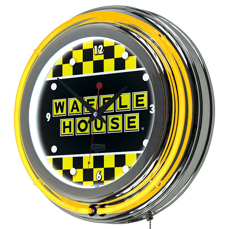 Waffle House Checkered Chrome Finish Neon Wall Clock, Yellow Description